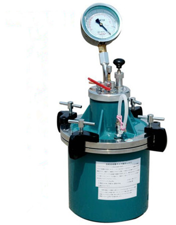 用20kg/lg电子天平称量,量出仪器的净重,记好数值,把量钵体里面装满水,盖上盖子用压紧阀拧紧,把溢流阀松开,用吸耳球往水龙头里注水,一直到水从溢流阀孔溢出为止,再把溢流阀拧紧,称出水的重量。然后,把所有的阀关闭,用充气――,停3-5秒,按动进气阀,指针回至零点,校正完毕。