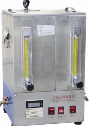 容器全部由不锈钢制成,分为两室,蒸馏室位于右侧,储存室(包括冷凝器)位于左侧。蒸馏室的容积约为10升,储存室的容积为6升,容器下部各有一水咀,右侧为放出沥青溶液的水咀,左侧为放出已回收溶剂的水咀,蒸馏室下部设有二组电阻丝式加热器。冷凝器位于左侧储存室的上部。由8层盘管组成,直接与自来水连接进行冷却,上盖用耐腐蚀胶圈密封,防止三氯乙稀的蒸发气体跑出,污染工作环境,温控器位于电器盒内,温控器触头与加热介质接触,到设定温度时立即断电,整个过程自动完成。