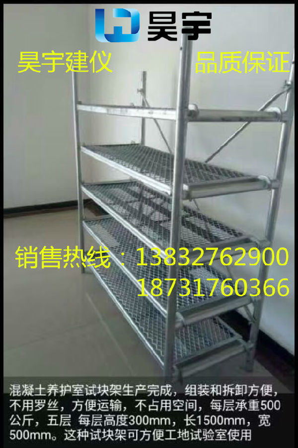 河北昊宇试验仪器有限公司制造的水泥砼试块养护架适用于恒温恒湿混凝土养护室专用水泥、砼试块养护架采用优质钢材精心焊接而成,表面采用热镀锌处理经久耐用,从而保证养护架的牢固性和承受试块压力性能,组装和拆卸非常方便,不使用螺丝,运输方便,占用空间小,共分5层,每层可承重260公斤,每层高度300mm,总长度1500mm,宽500mm,总高度1700mm。这种试块架子非常适合建筑工程监理公司、施工单位、大专院校、水泥厂试验室、商砼搅拌站试验室等工地养护试验室使用。受到工地试验室人员一致好评!