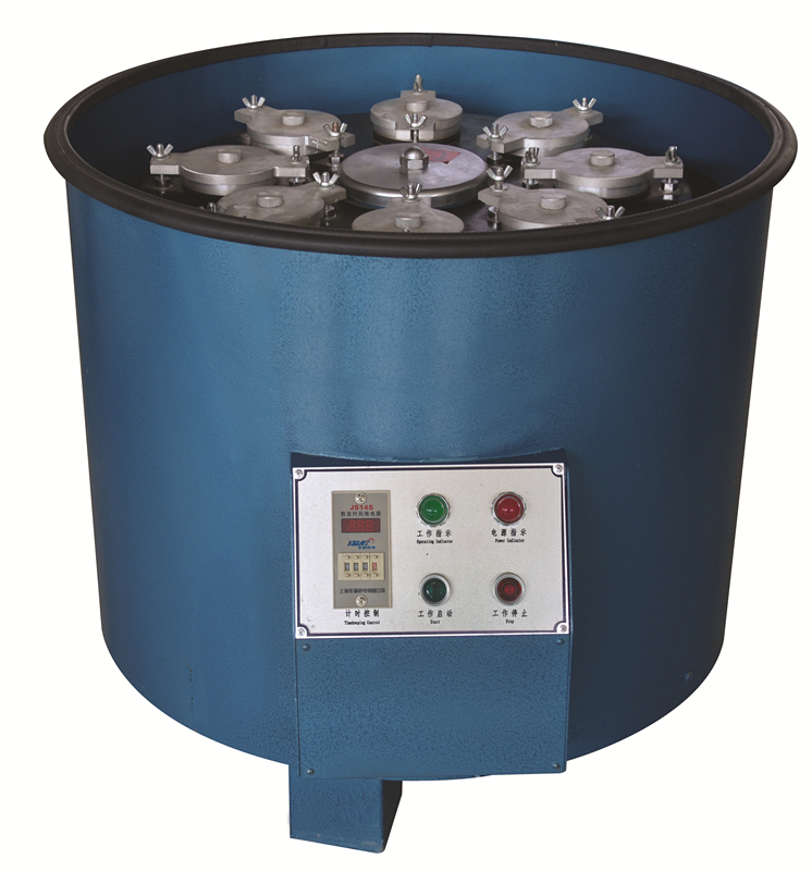 由机体、传动机构、支承转盘、八个带橡胶密封的金属夹具盒和电控装置组成。电机通过传动机构,支承盘以每分钟300转速运转,随之产生22.5mm的偏心距(e),因此,使每块试样做直径为45mm的圆周运动,从而使磨料在试样釉面上研磨,电控装置将预先设定的转数进行控制,当达到预定转数时,可自动停机。具有结构新颖、运转平稳、噪音低、操作简便,可同时作8个和少于8个样品的试验,由于配置有数显时间继电器,操作者只需接通电源,不需任何监视,它将按照所设定的时间(转数)自动完成。